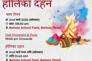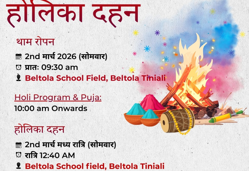 थर्ड आई न्यूज गुवाहाटी I मारवाड़ी युवा मंच, बेलतला शिखर शाखा द्वारा होलिका दहन एवं होली उत्सव का आयोजन 2 मार्च 2026 (सोमवार) को बेलतला स्कूल फील्ड, बेलतला तिनिआली में किया जाएगा। शाखा की ओर से आयोजित इस धार्मिक एवं सांस्कृतिक कार्यक्रम में बड़ी संख्या में श्रद्धालुओं और स्थानीय नागरिकों के शामिल होने की संभावना…