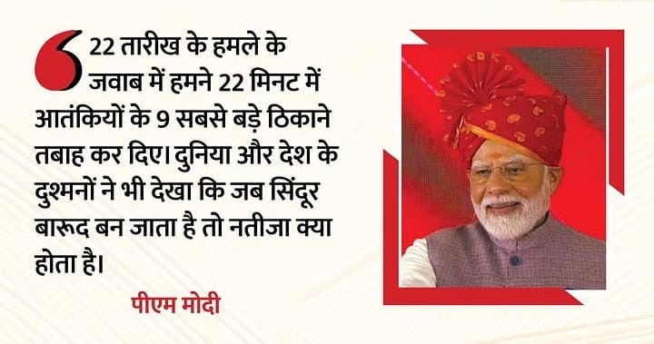 पीएम मोदी ने कहा कि एयर स्ट्राइक के बाद चूरू में मैंने कहा था- शपथ है मुझे इस मिट्टी की कि मैं देश को मिटने नहीं दूंगा, देश झुकने नहीं दूंगा…। आज मैं राजस्थान की धरती से देशवासियों से बड़ी नम्रता के साथ कहना चाहता हूं कि देश के कोने-कोने में तिरंगा यात्राओं का हुजूम उमड़ पड़ा है। जो सिंदूर मिटाने निकले थे, उन्हें हमने मिट्टी में मिला दिया है। जो हिंदुस्तान का लहू बहाते थे, आज उनसे एक-एक कतरे का हिसाब चुकाया गया है। जो सोचते थे कि भारत चुप रहेगा, आज वे अपने घरों में दुबके बैठे हैं। जो अपने हथियारों पर घमंड करते थे, आज वे मलबे के ढेर में दबे पड़े हैं।