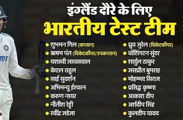 इंग्लैंड दौरे के लिए भारतीय टीम: शुभमन गिल (कप्तान), ऋषभ पंत (विकेटकीपर/उपकप्तान), यशस्वी जायसवाल, केएल राहुल, साई सुदर्शन, अभिमन्यु ईश्वरन, करुण नायर, नीतीश रेड्डी, रवींद्र जडेजा, ध्रुव जुरेल (विकेटकीपर), वॉशिंगटन सुंदर, शार्दुल ठाकुर, जसप्रीत बुमराह, मोहम्मद सिराज, प्रसिद्ध कृष्णा, आकाश दीप, अर्शदीप सिंह और कुलदीप यादव।