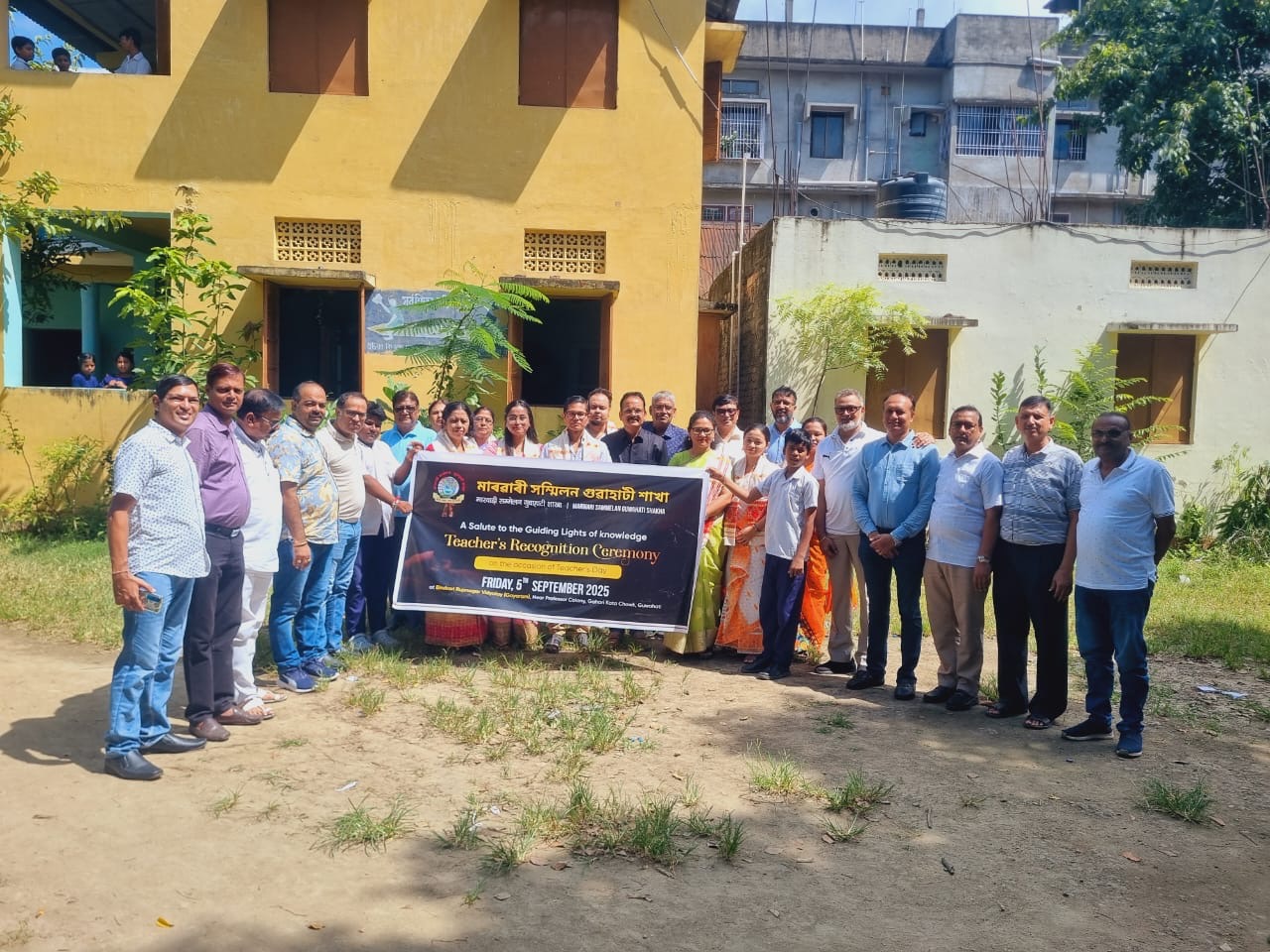 गुवाहाटी । मारवाड़ी सम्मेलन, गुवाहाटी शाखा द्वारा शिक्षक दिवस के पावन अवसर पर बिरुबारी रूपनगर विद्यालय (गयाराम) प्रोफेसर कालोनी, ग़ाहोरी चौक, गुवाहाटी में एक भव्य शिक्षक सम्मान समारोह का आयोजन किया गया। इस अवसर पर विद्यालय की सभी अध्यापिकाओं एवं अध्यापकों को सम्मानित कर उनके योगदान को नमन किया गया।