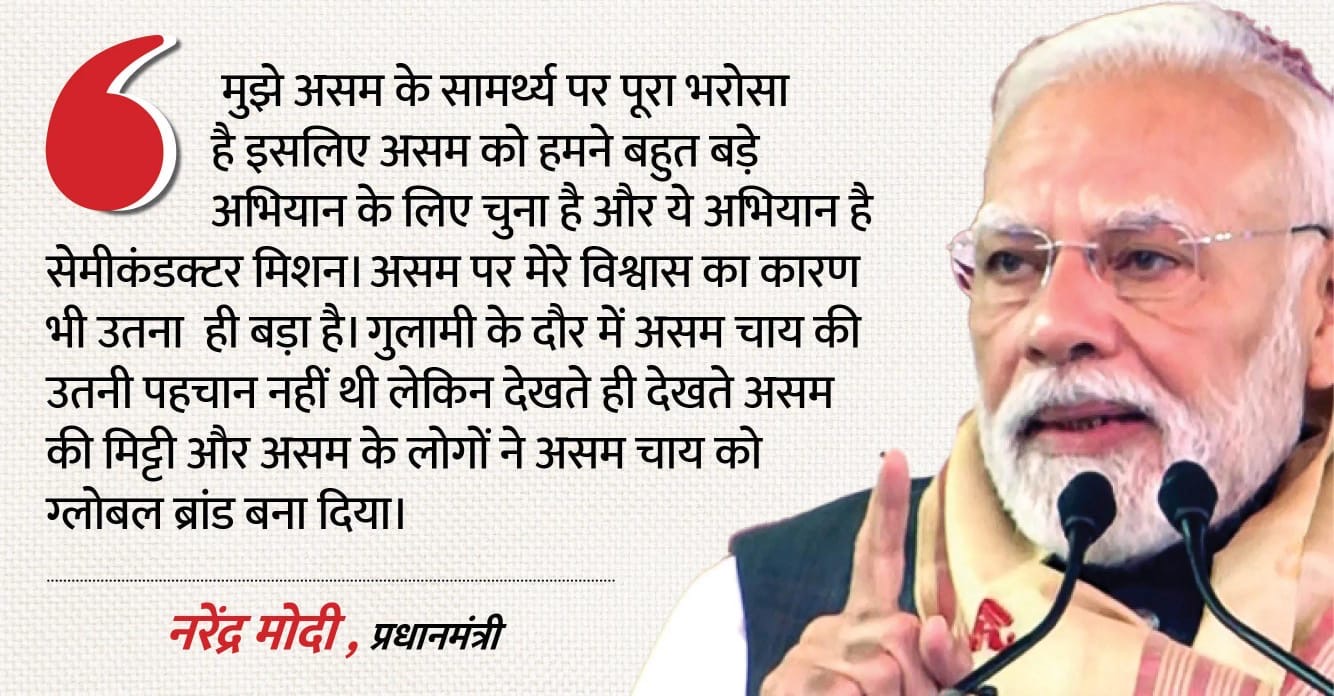 उन्होंने कहा कि गुलामी के दौर में असम की उतनी पहचान नहीं थी। अब असम की मिट्टी और लोगों ने असम को ग्लोबल ब्रांड बना दिया है। भारत को आत्मनिर्भर होने के लिए ऊर्जा और सेमीकंडक्टर चाहिए। असम की इसमें बड़ी भूमिका है। आज हर इलेक्ट्रॉनिक चीज की आत्मा छोटी चिप में होती है। यह चिप भारत में ही बनेगी। सेमी कंडक्टर का बड़ा आधार असम को बनाया है। असम में 27 हजार करोड़ से प्रोजेक्ट बन रहा है। कांग्रेस ने असम में कई दशकों तक सरकार चलाई है। कांग्रेस ने असम को कुछ नहीं दिया है I
