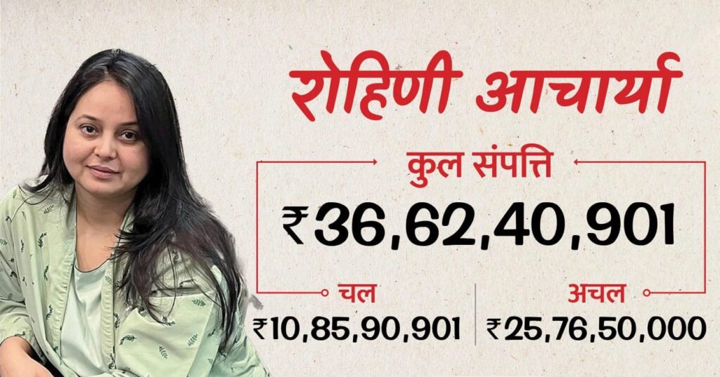 रोहिणी आचार्य लालू-राबड़ी की दूसरी बेटी हैं। रोहिणी को 2024 के लोकसभा चुनाव में सारण से चुनाव लड़ाया गया था, हालांकि वे यहां से हार गई थीं। रोहिणी आचार्य 2022 में अपने पिता लालू यादव को किडनी देकर चर्चा में आई थीं। रोहिणी की शादी 2002 में राव समरेश सिंह के साथ हुई है। समरेश कंप्यूटर इंजीनियर हैं। 2024 में लोकसभा चुनाव के दौरान चुनाव आयोग को दी गई जानकारी के अनुसार रोहिणी के पास कुल 36,62,40,901 संपत्ति है। रोहिणी के पास 10,85,90,718 रुपये की चल और 25,76,50,000 रुपये की अचल संपत्ति है। इस संपत्ति में 12,82,50,000 रुपये की अचल और 5,08,21,352 रुपये की चल संपत्ति खुद रोहिणी के नाम पर है। बाकी संपत्ति उनके पति और बच्चों के नाम पर है।