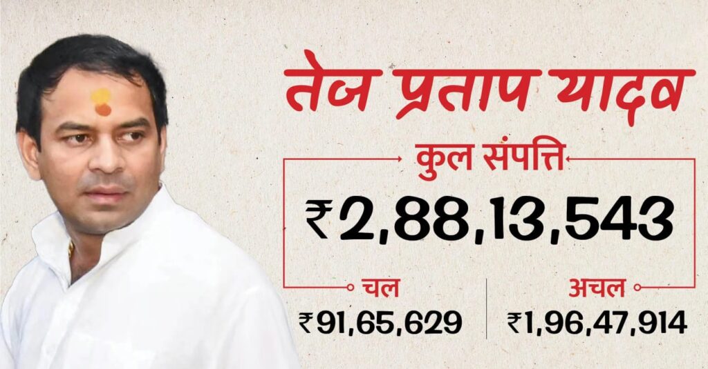 लालू यादव के बड़े बेटे तेज प्रताप बिहार सरकार में मंत्री भी रह चुके हैं। 2025 के बिहार चुनाव में परिवार और पार्टी से अलग होने के बाद उन्होंने खुद का दल जनशक्ति जनता दल बनाया। इसी पार्टी के टिकट पर महुआ सीट से चुनाव लड़ा, लेकिन हार गए। तेज प्रताप ने अपने चुनावी हलफनामे में जो जानकारी दी है उसके अनुसार उनकी कुल संपत्ति 2,88,13,543 रुपये की है। इसमें 91,65,628 रुपये की चल और 1,96,47,914 रुपये की अचल संपत्ति है।