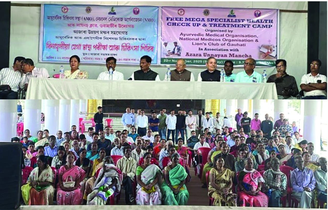 गुवाहाटी, 25 नवंबर। महानगर के सीमावर्ती आजरा इलाके में लायंस क्लब ऑफ गौहाटी की ओर से ग्रामीणों के लिए निःशुल्क मेगा स्वास्थ्य जांच शिविर का आयोजन किया गया। क्लब के जनसंपर्क अधिकारी संजय संथोलिया ने बताया कि अध्यक्ष राजेश हंसारिया के नेतृत्व में आजरा सभागार में इस शिविर का आयोजन असम मेडिकल ऑर्गेनाइजेशन (एएमओ) तथा नेशनल मेडिकोज ऑर्गेनाइजेशन के अलावा आजरा डेवलपमेंट डिपार्टमेंट के सहयोग से किया गया। शिविर में 458 से अधिक ग्रामीणों ने अपना नाम पंजीयन कराया, जो इस शिविर की सार्थकता को प्रमाणित करता है। इनमें से 137 रोगियों ने नेत्रजांच करवाई, जिनमें से 40 लोग मोतियाबिंद से ग्रस्त पाए गए। वहीं 452 लोगों के मधुमेह की जांच की गई एवं 257 लोगों को लेबोरेटरी जांच निःशुल्क उपलब्ध कराया गया।