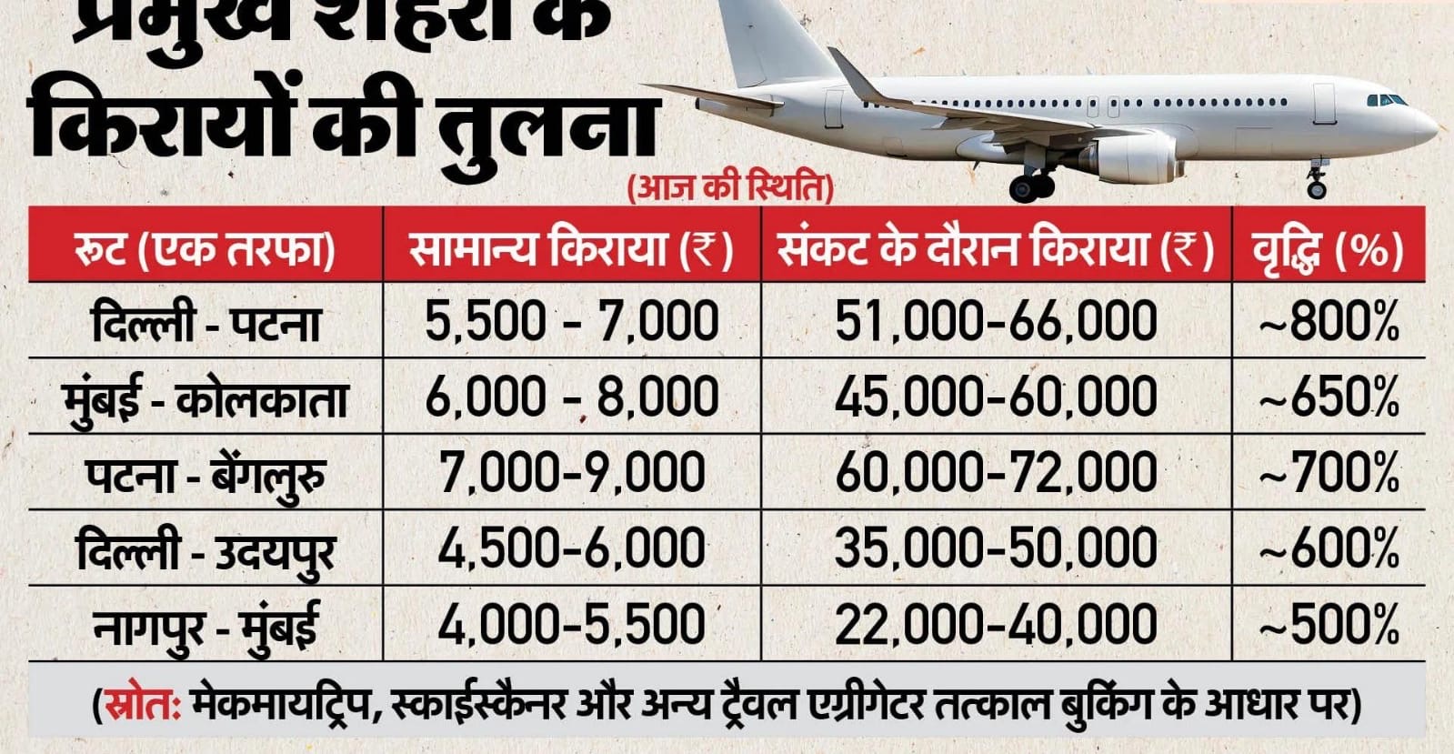 विभिन्न ट्रैवल पोर्टल्स और बुकिंग वेबसाइटों के ताजा आंकड़ों के मुताबिक, जिन रूट्स पर इंडिगो का दबदबा था, वहां सबसे ज्यादा मारामारी है। चूंकि इंडिगो के पास घरेलू बाजार की 60% से अधिक हिस्सेदारी है, उसके लड़खड़ाते ही पूरा सिस्टम चरमरा गया है। कई जगहों के लिए ‘स्पॉट फेयर’ में 800% तक का इजाफा दिखा है। जैसे पटना से दिल्ली का किराया जो आम तौर पर 6 से 10 हजार के बीच होता है वह बढ़कर 66 तक पहुंच गया है।