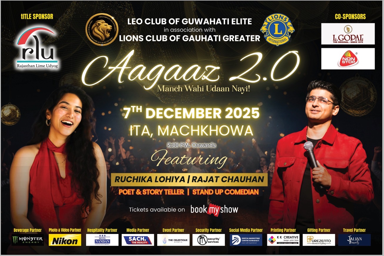 गुवाहाटी I लायंस क्लब ऑफ गुवाहाटी ग्रेटर एवं लियो क्लब ऑफ गुवाहाटी एलिट के संयुक्त तत्वावधान में आगामी 7 दिसंबर 2025, रविवार, को बहुप्रतीक्षित सांस्कृतिक संध्या “आगाज़ 2.0” का भव्य आयोजन किया जाएगा। यह कार्यक्रम स्थानीय माछखोवा स्थित आईटीए कल्चरल कॉम्प्लेक्स में शाम 5:00 बजे से प्रारंभ होगा। इस वर्ष की थीम “मंच वही, उड़ान नई” रखी गई है।