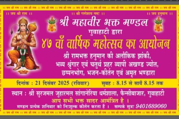 थर्ड आई न्यूज गुवाहाटी I गुवाहाटी के फैंसी बाजार स्थित श्री सुरजमल जुगलमल सांगानेरिया धर्मशाला में आगामी 21 दिसंबर 2025 (रविवार) को श्री महावीर भक्त मंडल, गुवाहाटी द्वारा 47वें वार्षिक महोत्सव का भव्य आयोजन किया जाएगा। यह धार्मिक कार्यक्रम सुबह 8:15 बजे से सायं 8:15 बजे तक चलेगा। महोत्सव के अवसर पर श्री रामभक्त हनुमान…